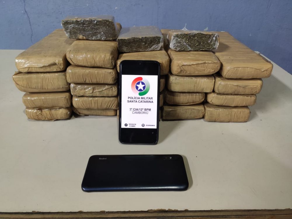 Refazendo o trajeto, foram localizadas duas mochilas cheias, contendo 21 tabletes, mais 3 porções grandes, de maconha.