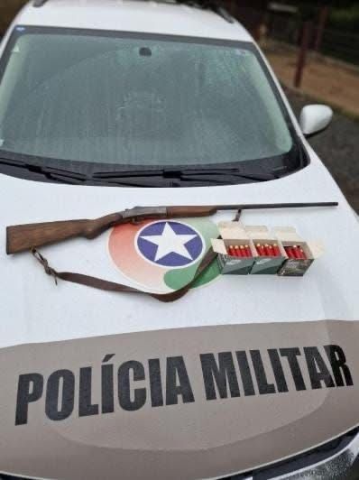 Dentro da residência, a mulher relatou que o suspeito a ameaçou de morte utilizando uma arma de fogo e tentou estrangulá-la. Ela autorizou a entrada da guarnição, mostrando onde o agressor havia escondido uma espingarda calibre .32, localizada sob uma cama, além de entregar três caixas de munições intactas.