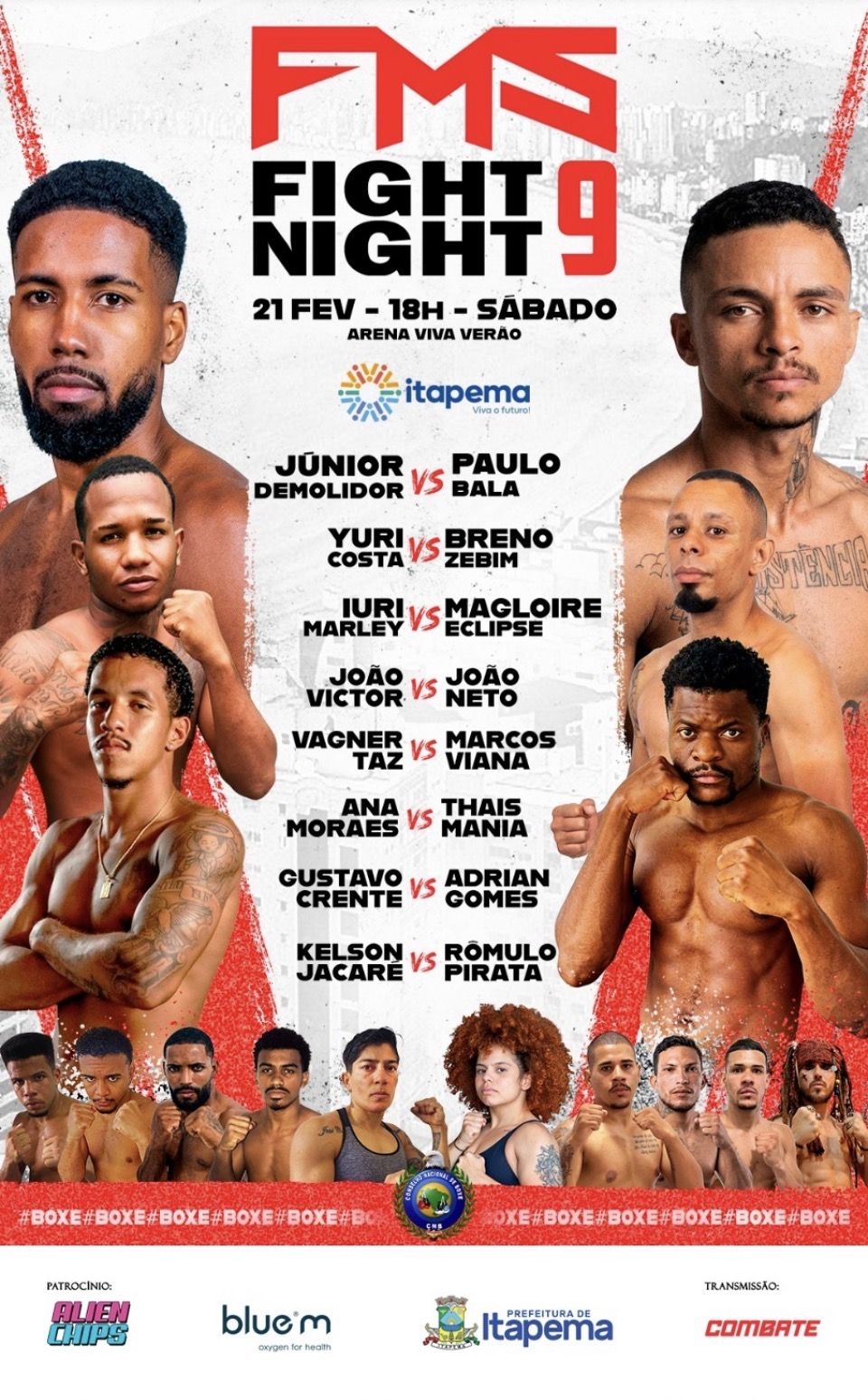 Neste sábado (21/02), Itapema será palco de um dos maiores eventos de boxe profissional do país: a 9ª edição do FMS Fight Night. A programação começa às 18h, na Arena Viva Verão, reunindo grandes nomes do esporte em uma noite de pura adrenalina.