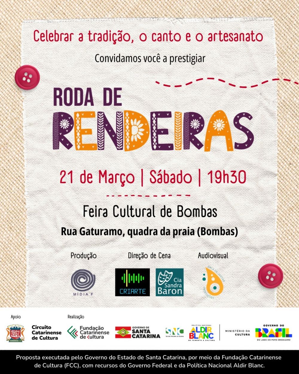 O espetáculo Roda de Rendeiras é um projeto realizado pelo Governo do Estado de Santa Catarina, por meio da Fundação Catarinense de Cultura (FCC), com recursos do Governo Federal e da Política Nacional Aldir Blanc.