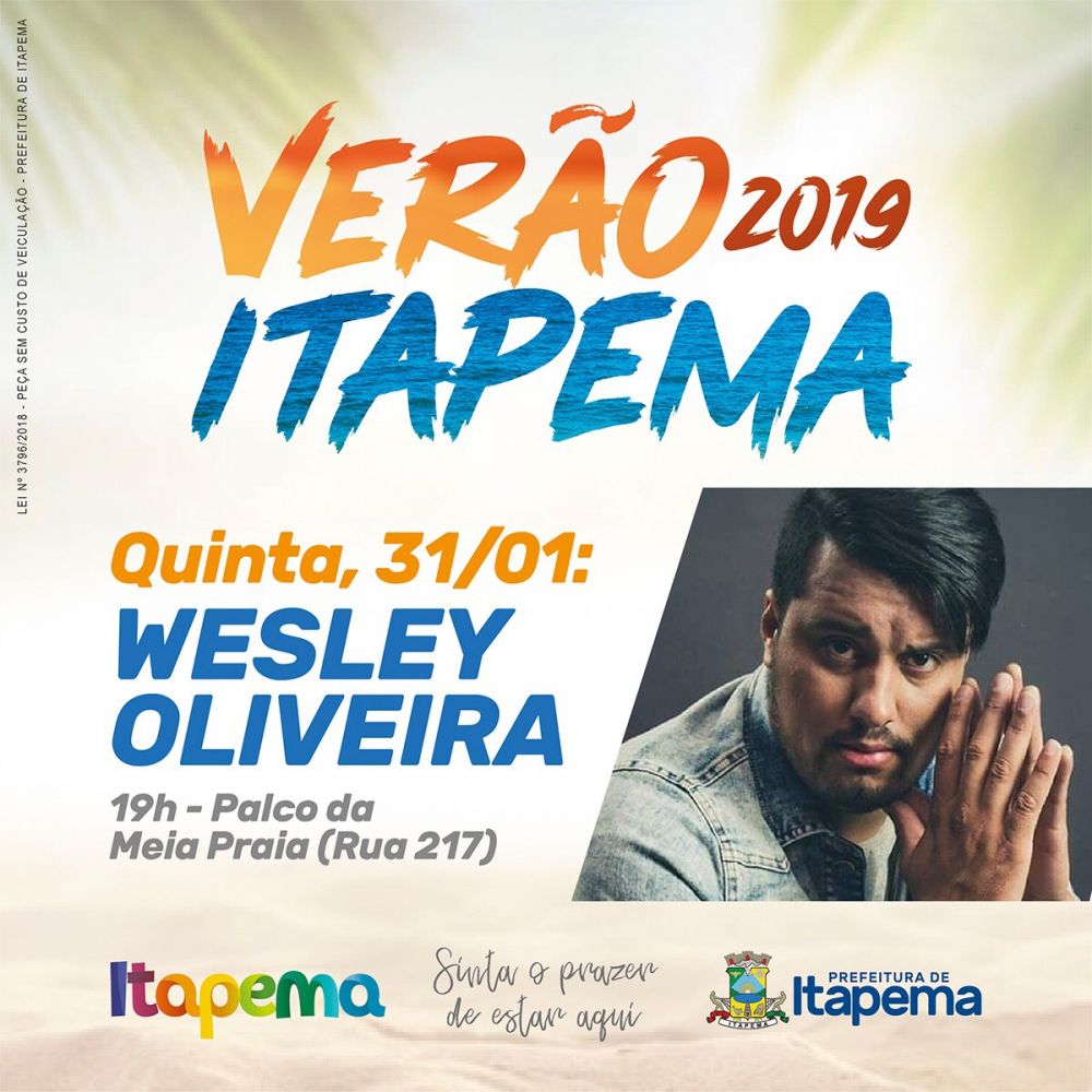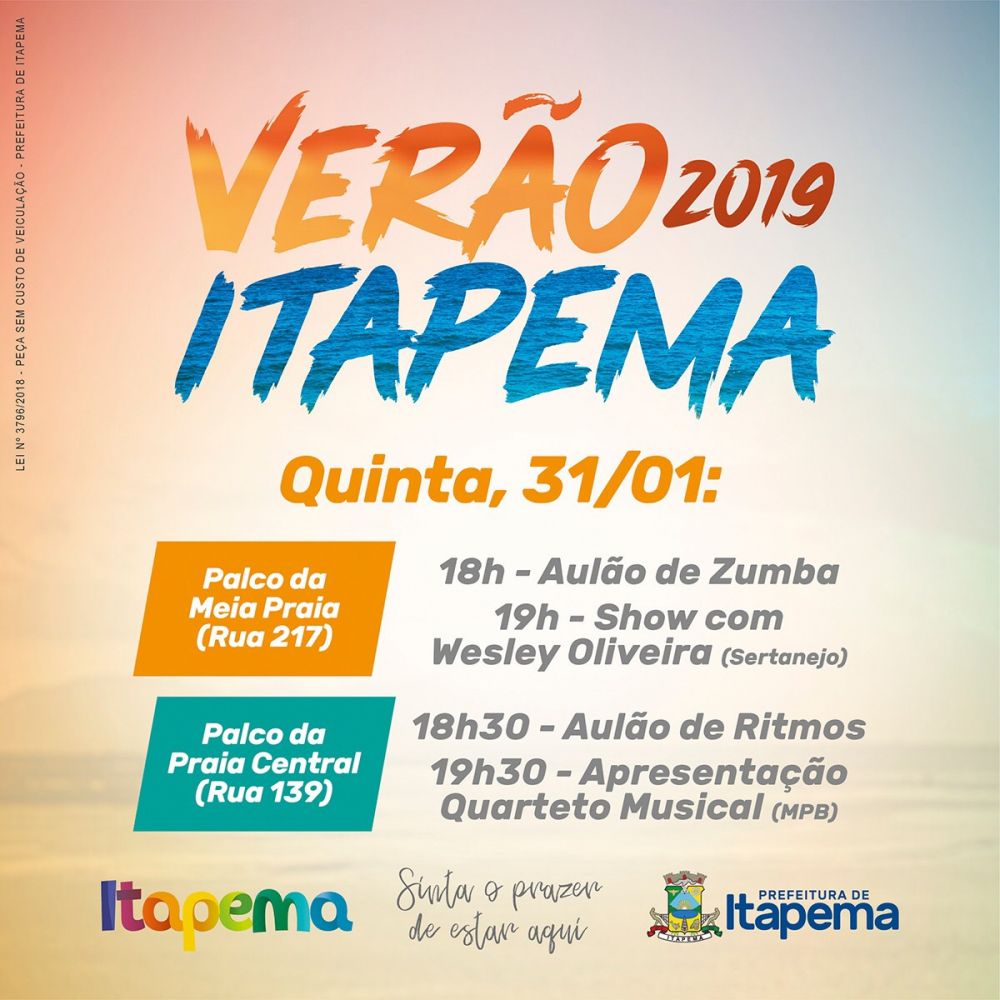 A programação do Projeto Verão Itapema 2019 termina nesta quinta-feira (31/01). E para encerrar as atividades uma programação especial acontece nos dois palcos. Na Meia Praia (Rua 217) terá Aula de Zumba, a partir das 18h e o Show Sertanejo com Wesley Oliveira, às 19h. Já na no Centro (Rua 139), tem aulão de ritmos, às 18h30 e apresentação do Quarteto, às 19h30.