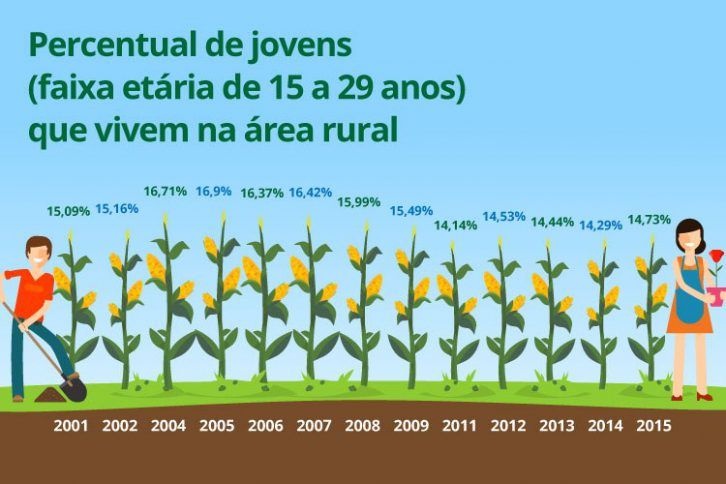 Segundo o Instituto, o meio rural tinha em 2015 cerca de 7,1 milhões de pessoas entre 15 e 29 anos, o que correspondia a 14,7% da população total de jovens do país. Nas cidades, os jovens de 15 a 29 anos somaram cerca de 41,2 milhões, em 2015.