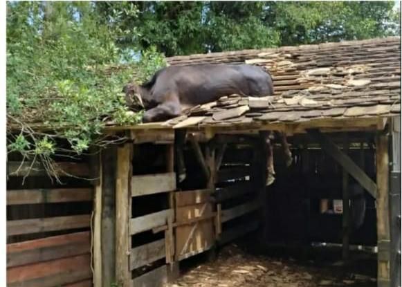 Mistério: Vaca vai parar em cima de telhado no Vale do Itajaí